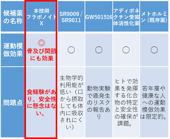 現代社会において、仕事の忙しさやストレス等から、肥満、高血圧、糖尿病等の生活習慣病のリスクが高まっている。その解消のために運動が効果的であるが、高齢者、病人や痛み等の身体的問題により運動ができない人、または運動が苦手な人がいる。 そこで、運動をしなくても、運動をしたことと同様な効果が得られる運動模倣薬(エクササイズピル)の開発が求められている。